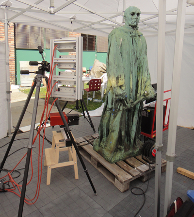 Scientists from Norway, Sweden and Italy have investigated the use of hyperspectral imaging (HSI) to detect the corrosion products brochantite and antlerite in two selected areas of a bronze statue, the results of which are reported in the Journal of Spectral Imaging (doi: https://doi.org/10.1255/jsi.2018.a10). The statue investigated was The Man with the Key. It represents Jean d’Aire and it is the first individual figure cast in bronze from the famous group Les Bourgeois de Calais (The Burghers of Calais) by Auguste Rodin. The sculpture was cast by Jacques Petermann in Brussels, Belgium. Since 1902 it has been displayed at “Solli plass”, a traffic-congested area in the city centre of Oslo, Norway, which is likely to have been subjected to high levels of SO2 pollution and acidic rain conditions. The sculpture was in a state of advanced degradation and was relocated to the courtyard of the Vigeland Museum for conservation. The HSI investigation was performed there.