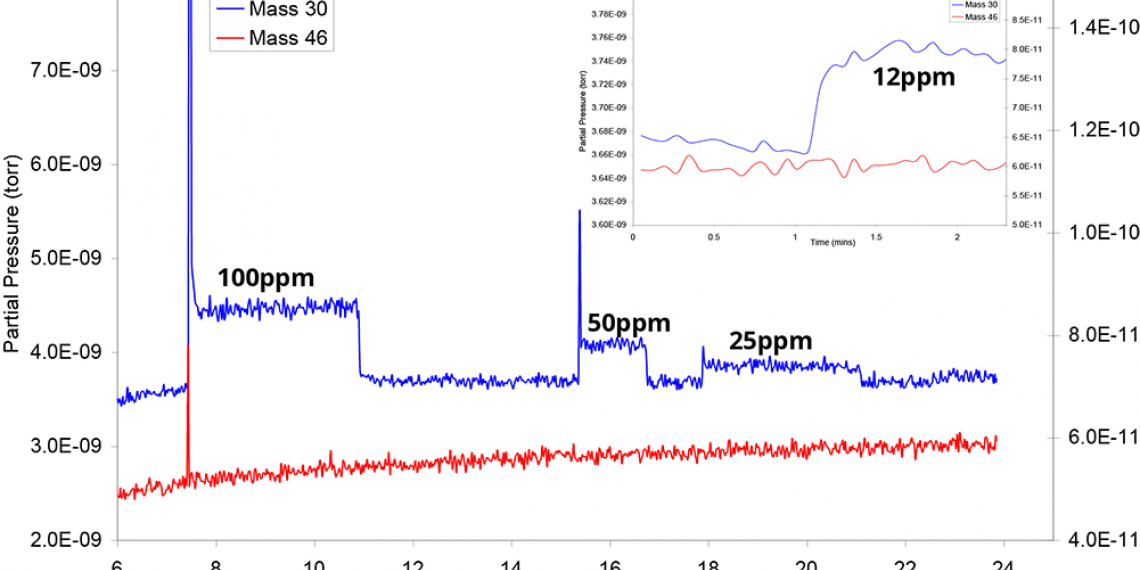 One important aspect of catalysis research is the reduction of NOx in such applications as car exhausts and power plants. This research involves many challenges in meeting current emission legislation whilst keeping catalyst cost low. Several NOx reduction technologies have emerged in previous years, some of which have now been commercialised including selective catalytic reduction (SCR) with NH3, urea and hydrocarbons, and NOx storage and reduction (NSR). NSR technology consists of two cyclic steps that occur on a lean NOx trap (LNT) catalyst. The LNT catalyst readily stores NO2 as compared to NO. For this reason, NO should be oxidised to NO2 to achieve an acceptable level of NOx storage. This application note describes the measurement of NO2 using the m/z 46 peak and the NO/NO2 ratio in a research application using the Hiden HPR-20. The data highlights the ability of the QIC series gas analysis systems to deconvolute and quantify low levels of NO in high concentrations of NO2.