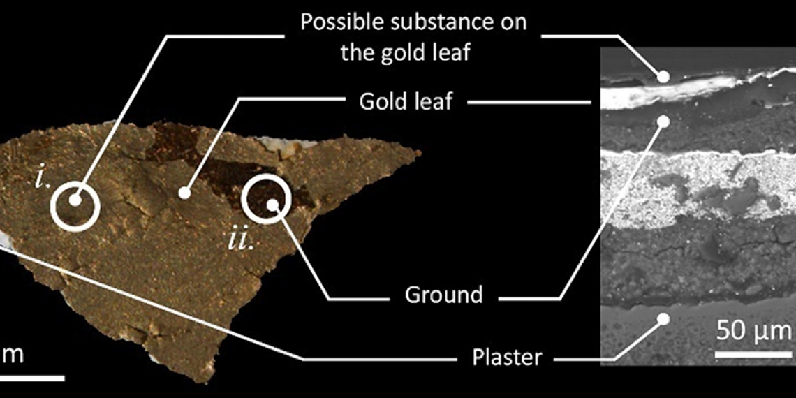 Gildings are commonly found highlighting details of ornamental or iconographic value such as halos. They are documented on a variety of artefacts including statues, stuccos, wall paintings as well as paintings on canvas, wood panels and illuminated manuscripts. Gildings consist of µm-thick leaves of different metals (e.g., gold, silver, metal alloys) applied to the substrate by a thin adhesive ground layer. Depending on the gilding technique, the composition of the ground may vary from mainly inorganic to mainly organic, and may be coloured with pigments (as e.g., lead pigments, ochres). Over time, such materials undergo unavoidable decay due to oxidation of metal leaves and loss of adhesive properties of the ground, hence conservation treatments can be applied to restore the mechanical–optical properties of the original materials, or to protect the gilding from further interaction with the environment. This note investigates the gilding technique.