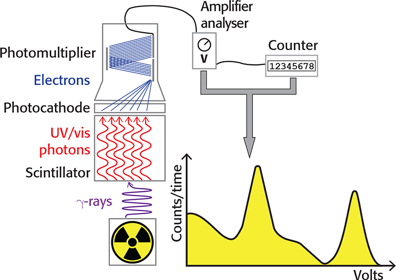 A photocathode coupled to the crystal emits electrons when hit by light, proportionally to the number of photons in the flash and, therefore, to the energy of the incident gamma photon. The electrons emitted by the photocathode can be amplified by a photomultiplier tube (PMT), thus obtaining a detectable electrical impulse. The amplitude of the impulse, expressed in volts, is linearly proportional to the energy of the gamma photon. The number of electrical impulses in a given time interval can be measured with a counter. With an amplifier/pulse height analyser, it is possible to select the range of pulse amplitudes (in volts) to be counted and build a gamma spectrum with the pulse amplitudes in the abscissa, while the number of counts is reported in the ordinate. The main components of a scintillation detector are depicted in Figure 1.