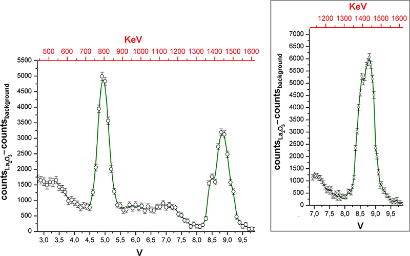 The gamma spectrum of La2O3 reported in Figure 3 was recorded by varying the centre of the SCA potential window with 0.1 V steps. The potential window was set to 0.1 V. The counter time was 180 min. Every measurement was carried with and without the sample in order to subtract the background. The error associated with the ordinate values was conservatively estimated by the sum of the square roots of the two counts. The inset of Figure 3 was obtained by reducing the potential steps and window to 0.05 V, while the counter time was increased to 420 min.