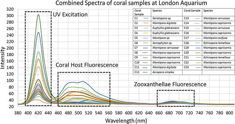 In order to characterise the subtleties of this natural fluorescence, coral samples at the London Aquarium, provided by coral aquarist Jack Willans, were imaged using a push-broom type hyperspectral camera (Headwall Nano, USA).