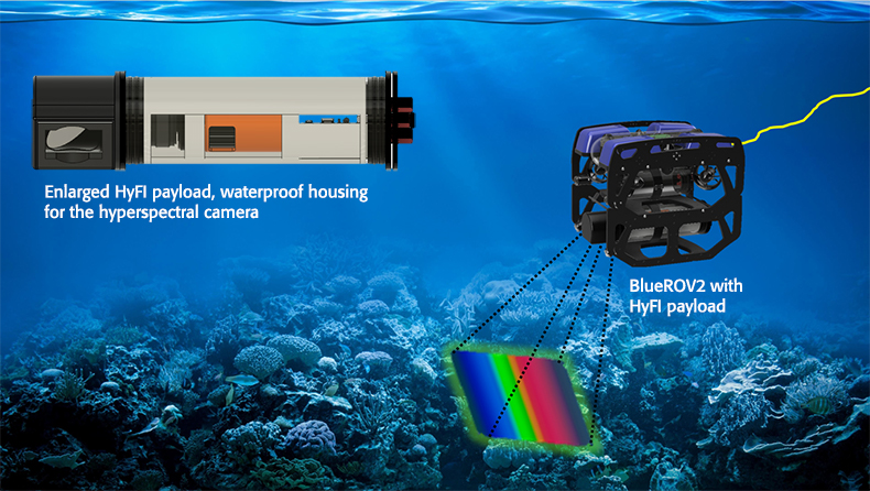 The field deployable system will be in the form of a portable fully waterproof low-cost hyperspectral imaging system (payload) that can be mounted to an ROV (remotely operated vehicle) (BlueROV2, BlueRobotics) which will act as a stable platform for obtaining images, similar to that provided by drone (UAV) systems in agricultural applications.