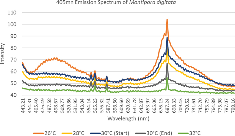Figure 3. A spectral observation of the “bleaching effect”, as the temperature increases observed fluorescence in both the host tissue and zooxanthellae decreases.