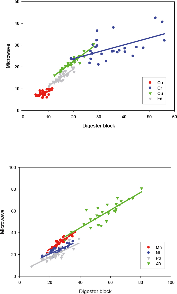 After the validation process, the digestion methods were applied to calcareous soil samples selected from agricultural soils in the Lower Segura basin, a pilot area of the Valencian Mediterranean region, in order to compare results obtained by open vessel digestion with those obtained by microwave-assisted digestion. A total of 29 calcareous soil samples were analysed using both methods to determine their heavy metal contents. Characteristics of the study area and sampling procedure are described in full in a previous paper.5 Summary statistics are given in Table 2 and are recorded for each element. Further, the paired-samples t-test was used to compare heavy metal contents obtained by both methods. A low significance value (p < 0.05) indicates that there is a significant difference between both populations and, therefore, a significant difference between results achieved by both digestion methods for a given element. As it was expected, the results obtained are different for some heavy metals. Application of the paired-samples t-test demonstrated that there was a significant difference for Co, Cr, Cu, Mn, Ni and Pb when results were analysed sample by sample. On the other hand, linear regression showed a good correlation between open vessel digestion and microwave-assisted digestion for Cu, Fe, Mn, Ni, Pb and Zn (R2 > 0.75) (Figure 1). This finding suggests that open vessel digestion may be equivalent to microwave-assisted digestion for determining these elements in the study area. However, Co and Cr presented a low determination coefficient (R2 < 0.50) indicating a slight difference between the methods. Thus, open vessel digestion and microwave-assisted digestion are not interchangeable for evaluating these elements. On the other hand, RSD values recorded for microwave-assisted digestion were lower than values found for open vessel digestion, reflecting a lower variability in the whole population by microwave digestion. This is due to a greater variability with the digester block, since digestion is carried out in open vessels and splashing can be produced between vessels. In fact, the digester block produces loss of volatile elements and presents a high potential for contamination. Further, this conventional digestion system is the more time-consuming analytical process and, therefore, microwave oven digestion is preferred in some cases. It follows that the microwave-assisted digestion provides more reliable results and is also a quicker and safer extraction process with which to estimate heavy metal content for agricultural soils in the Lower Segura basin.