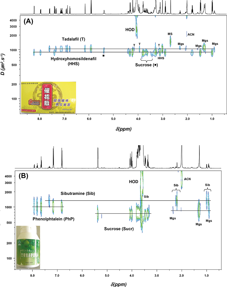 Figure 2 shows the DOSY NMR spectra of two formulations which the manufacturer advertised as “all natural” or containing only vitamins. The first formulation (A) was marketed for sexual dysfunction and the second (B) is sold as a natural slimming product; they were manufactured in Taiwan and China, respectively. DOSY NMR has the advantage of allowing the detection of the various components of complex mixtures in a single run. It has allowed the detection of adulteration in both examples without any prior knowledge of the samples’ contents.
