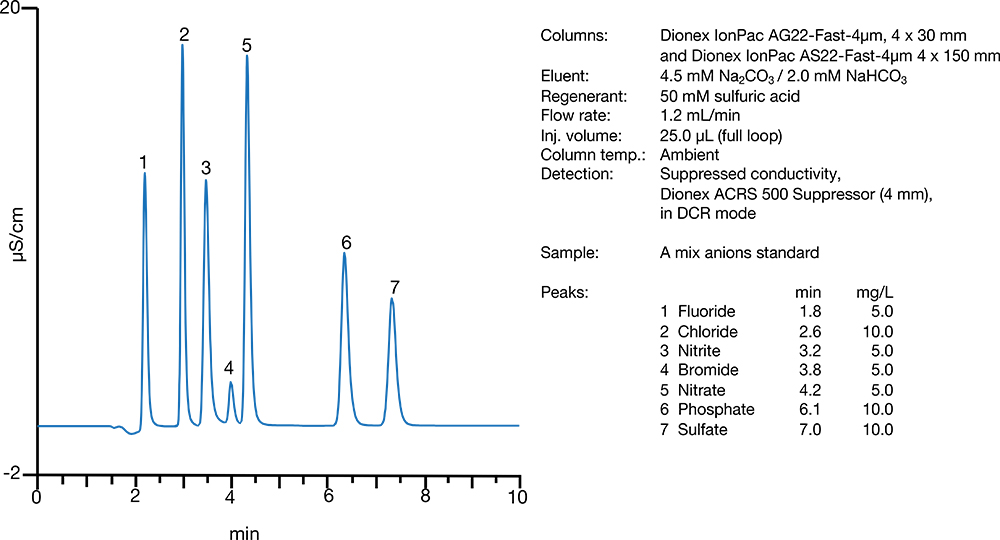 Figure 2 shows a separation of inorganic anions within 10 min using the Dionex IonPac AS22-Fast-4µm column. As this figure shows, seven inorganic anions are well resolved. The Dionex IonPac AS22-Fast-4µm column can be used for compliance monitoring of inorganic anions in water. Compared to the 15 min method using Dionex IonPac AS22 column, this method is fast and saves per injection, allowing two additional samples to be run every hour.
