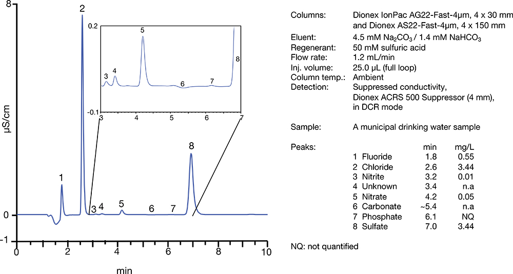 Figure 3. Analysis of municipal drinking water using the Dionex IonPac AS22-Fast-4μm columns.
