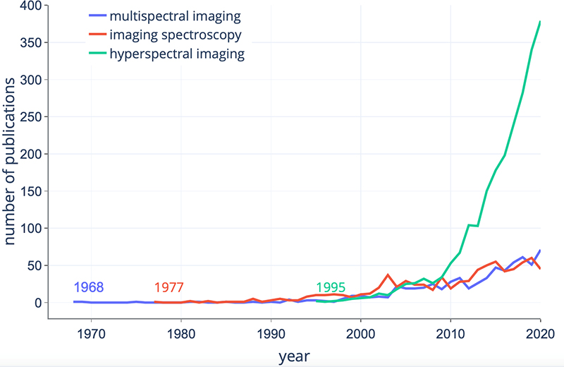 Figure 1. Web of Science title search hits for “hyperspectral imaging”, “multispectral imaging” and “imaging spectroscopy”. Updated from Reference 14.