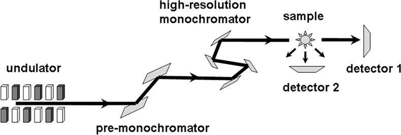 Figure 16. (Top) A sketch of a typical NIS spectrum. A high-resolution monochromator (HRM, see inset) is tuned around the nuclear resonance. The scattered intensity in forward direction (NFS) and perpendicular to the incoming beam (NIS) is monitored as a function of energy relative to Eγ (14.4 keV in case of 57Fe). Around E = Eγ, the elastic peak is overlaying the corresponding energy sidebands which are caused by phonon creation (E >  Eγ) and phonon annihilation (E < Eγ). (Bottom) The spectrum shows the intensity of the forward scattered radiation which is called the instrumental function.