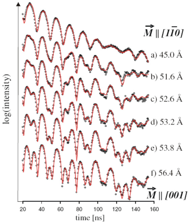 NFS has been used extensively to study the magnetic behaviour of iron monolayers as well as thin films. An example is the exploration of the magnetisation structure during the thickness-induced spin-reorientation transition (SRT) for a metallic iron film grown on a W(110) surface.39 Figure 18 shows the NFS data accumulated during continuous iron evaporation with film thicknesses of 45 Å up to 56.4 Å. The experimental trace changes significantly, which could be interpreted as reorientation of the film magnetisation from being parallel to the [110] axis in the case of a 45 Å film to the [001] direction of films with thicknesses larger than 56 Å.