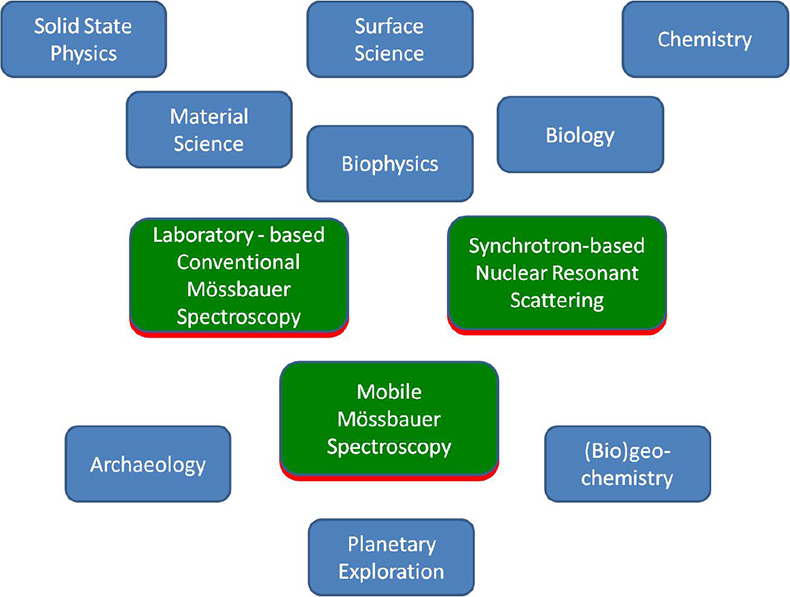 More than 50 years ago, the German physicist Rudolf L. Mössbauer, whilst working on his doctoral thesis under Professor Maier-Leibnitz at the Technical University in Munich and at the Max-Planck Institute in Heidelberg, discovered the recoilless nuclear resonance absorption of gamma rays which became known as the Mössbauer Effect.1–3 He was awarded the Nobel Prize for Physics in 1961 as one of the youngest recipients of this most prestigious award. The phenomenon rapidly developed to a new spectroscopic technique, which now bears Rudolf Mössbauer’s name. Mössbauer spectroscopy has made valuable contributions to widespread applications in solid state research, from fundamental studies in physics, chemistry, metallurgy, biological- and geo-sciences as well as to industrial and materials science applications. Figure 1 gives an overview of applications of Mössbauer spectroscopy in various research disciplines.