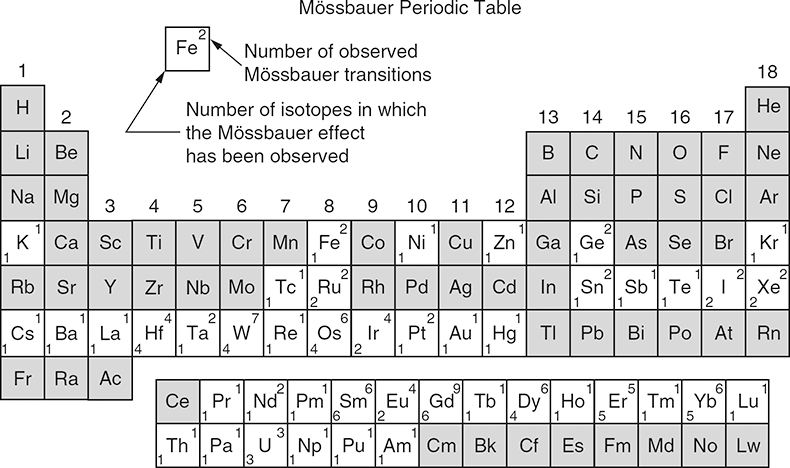The Mössbauer effect has been detected for a total of nearly 90 γ-ray transitions in 72 isotopes of 42 different elements. Figure 2 shows the Periodic Table of the elements in which the Mössbauer-active elements are marked. Due to several criteria (suitable lifetime of nuclear excited state, transition energy, easy accessibility and handling) only ca 20 elements can be studied by Mössbauer spectroscopy, for example, iron, tin, antimony, tellurium, iodine, gold, nickel, ruthenium, iridium, tungsten, krypton, xenon, many of the rare earth elements and neptunium. The most prominent “Mössbauer nuclide” is 57Fe. More than 90% of the nearly 80,000 publications that have appeared so far refer to 57Fe spectroscopy.