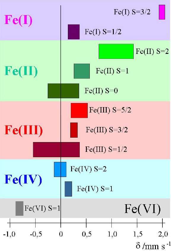 Figure 3. Ranges of isomer shift values expected for different oxidation and spin states of iron compounds (reproduced from Reference 17 with permission).