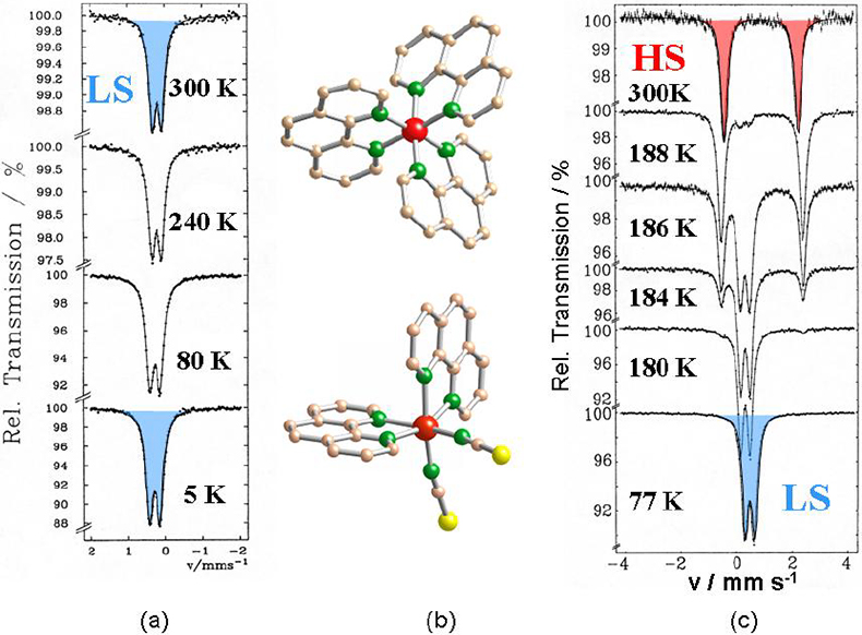 Study of thermal- and light-induced spin state switching in iron compounds. Thermally-induced spin transition from a high spin (HS) state with maximum unpaired electrons to a low spin (LS) state with minimum unpaired electrons, also known as spin crossover (SCO), can be encountered with many Fe(II) and Fe(III) compounds, if the energy difference between the two spin states becomes comparable to the spin pairing energy.10,1157Fe Mössbauer spectroscopy is ideally suited to follow quantitatively the spin transition as a function of temperature, since the individual spectra of the HS and LS states are entirely different and well resolved in most cases. An example is shown in Figure 7. [FeII(phen)3]X2 (phen = 1.10-phenanthroline) is a low spin compound at all temperatures under study as confirmed by the characteristic Mössbauer spectra on the left of Figure 7. If one of the relatively strong phen ligands, which occupies two co­ordination positions of the octahedron, is replaced by two mono-functional NCS groups, the average ligand field strength becomes weaker and the compound [FeII(phen)2(NCS)2] adopts a high spin character at room temperature. The Mössbauer spectrum at 300 K shows the typical features of an Fe(II) HS compound. On lowering the temperature, the compound changes spin state from high spin to low spin near 180 K, as is well documented by the Mössbauer spectra as a function of temperature, shown on the right-hand side of Figure 7.11,12