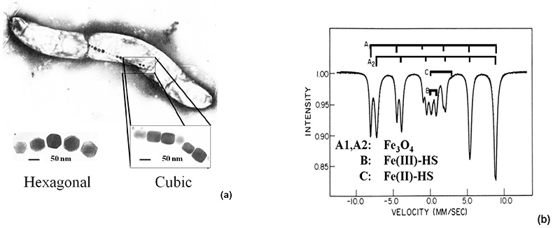 Study of magnetotactic bacteria. Aquaspirillum magnetotacticum, a magnetotactic bacterium living in the oceans, behaves as a biomagnetic compass and follows the weak geo­magnetic field due to the presence of Fe3O4 magnetic nanoparticles (40–120 nm) of hexagonal and cubic shapes in their bodies [Figure 8(a)]. The Mössbauer spectrum, recorded at 200 K, reveals two magnetic sextets typical of Fe3O4, an inverse spinel [Figure 8(b)]. The signals noted in the middle of the spectrum refer to Fe(III)-HS (B) and Fe(II)-HS (C), which are assumed to serve as a reservoir for the formation of the magnetic particles.13