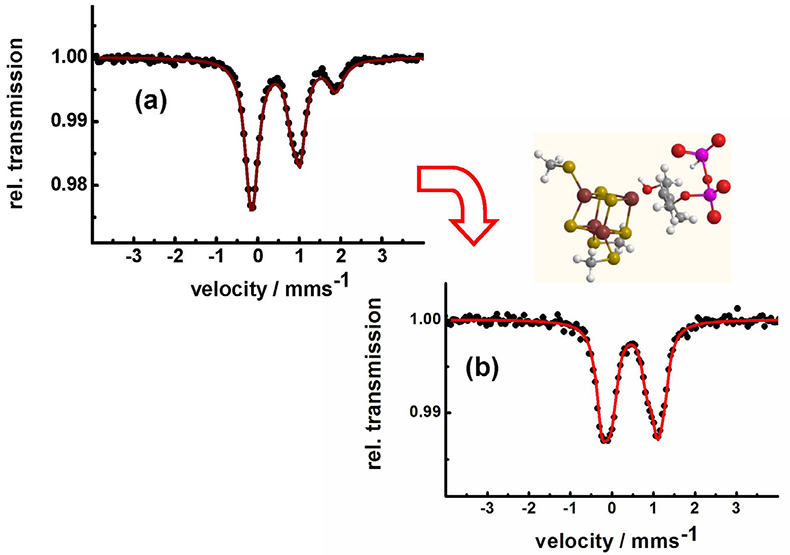 Identification of iron–sulfur clusters in pharmacological relevant iron proteins. One of the major successes of applications of Mössbauer spectroscopy in biological chemistry was the identification of the electronic states of polynuclear iron sulfur centres.14,15 Very recently, Mössbauer spectroscopy has been used to identify an unusual 4Fe–4S-centre in the Lytb-protein, also called IspH. This protein is crucial for the biosynthesis of isoprenoids in many bacteria and in the malaria parasite Plasmodium falciparum. In these pathogens, isoprenoid synthesis occurs according to the methylerythritol phosphate (MEP) pathway, an alternative to the mevalonate pathway in higher organisms and humans.16 Therefore, the MEP pathway is a valuable target for the development of new antimicrobial agents, as it is essential for micro­organisms and absent in humans. Figure 9 shows how the Mössbauer spectrum of the LytB protein changes after the docking of its substrate and after binding of inhibiting substrate analogues which are promising molecules for future antibiotics and antiparasitic drugs.
