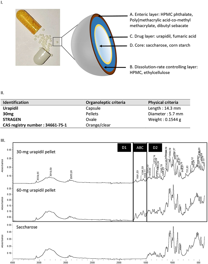 Figure 1. I) Photo of a capsule and interpretation of the geometry of urapidil pellets, assuming the presence of outer enteric and inner dissolution-rate-controlling layers surrounding the urapidil layer and core of the pellet. II) Identification made by MIND from organoleptic and physical criteria. III) ATR/FT-IR spectra of 30 mg and 60 mg urapidil crushed pellets and saccharose as the core excipient. Major saccharose contributions are shown in the D1 (3600–1750 cm–1) and D2 (1500–400 cm–1) parts of the ATR/FT-IR spectra of urapidil loaded pellets, while the ABC part is attributed to the contribution from the outer (A) and inner (B) layer components, as well as the drug layer (C).