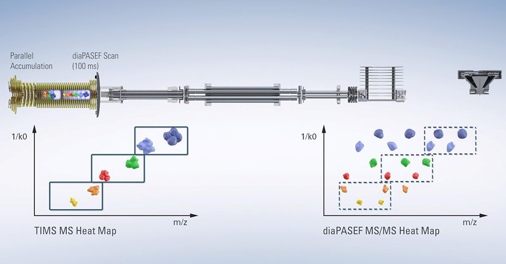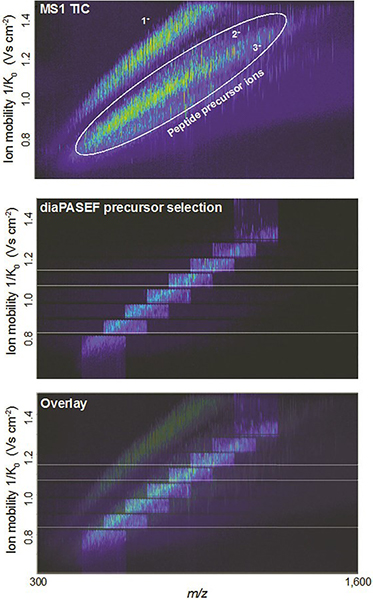 The impact of the addition of the ion mobility dimension on the proteomics field can be seen, for example, in the widespread adoption of Bruker’s timsTOF Pro instrument, which was designed to deliver greater sensitivity, selectivity and MS/MS acquisition speeds for proteomics research. The novel design allows for ions to be accumulated in the front section, while ions in the rear section are sequentially released depending on their ion mobility, and in subsequent scans selected precursors can be targeted for MS/MS. This process is called Parallel Accumulation Serial Fragmentation, or PASEF®.3