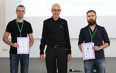 As the quality of the students talks this year proved again to be excellent, it was impossible to nominate only one, but two winners. The prize with a value of 750 Euro was split between André Dathe (Jena University Hospital, Germany) who gave a talk on “Single-Molecule FRET Analysis of Enzyme Conformations and Diffusion of Nanostructures in a Confocal ABELtrap” and Johan Tornmalm (KTH Royal Institute of Technology, Sweden) who presented his work on “Transient State Monitoring of Cellular Autofluorescence”.