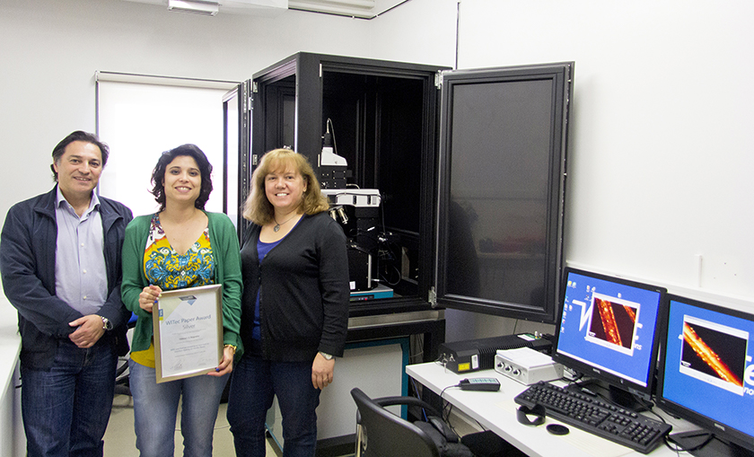 Helena Nogueira (right) with the paper’s first author Sara Feitaxa (middle) and Tito Trindade in front of their WITec confocal Raman microscope.