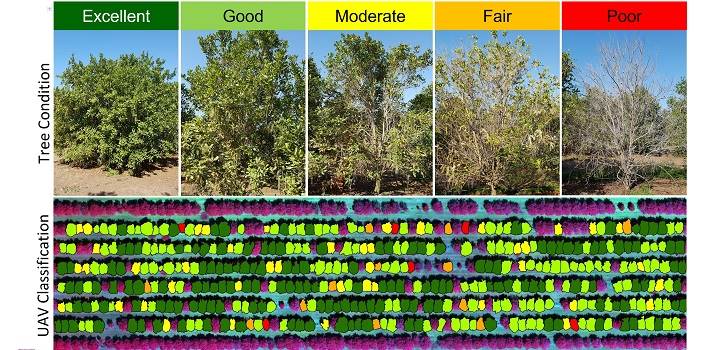 By combining data from UAV and satellite surveys, Johansen and co-workers were able to classify the health of individual trees on a five-point scale across large areas of macadamia plantations. Farmers can then use a map, like the one shown, to find and treat trees at risk. © 2020 Kaspar Johansen