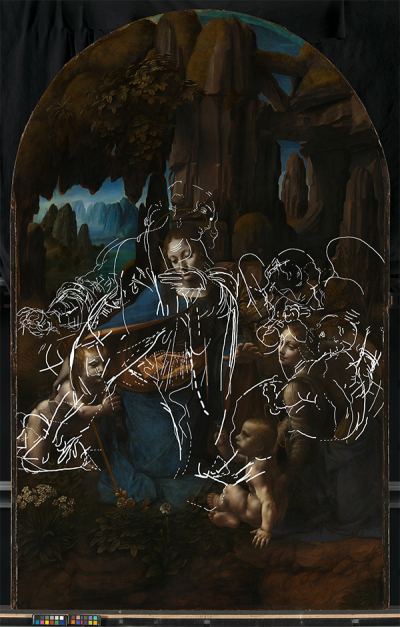 Why Leonardo abandoned this first composition still remains a mystery. The new research has shown how the second underdrawing, while aligning much more closely to the finished version, nonetheless displays his characteristic elaborations and adjustments from drawing to painting. For instance, the angle of the Infant Christ’s head was changed so that he was seen in profile, while some parts of the angel’s curly hair have been removed. Handprints resulting from patting down the priming on the panel to create an even layer of more or less uniform thickness can also be seen, probably the work of an assistant - but perhaps even by Leonardo himself.