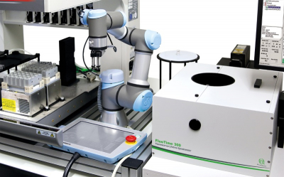 A recent software upgrade adding a remote interface to PicoQuant’s modular FluoTime 300 spectrometer makes it possible to interface it with external accessories, such as the liquid handling automation workstation Biomek NXP from Beckman-Coulter. This simplifies recording spectra for high-throughput applications in a convenient and reproducible manner. Additionally, it also allows obtaining spectroscopic snap shots at well-defined time points of reactions being carried out in the cuvettes of the liquid handling automation workstation.