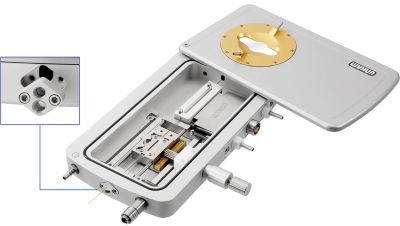 The capillary is inserted through the body of the chamber and housed in a 1.0 mm ø channel inside a 50 mm silver block. The block itself has been designed and engineered to provide a uniform temperature across the length of the capillary. Capillaries loaded into this channel can be moved 25 mm in the x direction and 3.5 mm in the y direction using the xy mechanism to allow for observation across the length of the sample in the capillary. The standard capillary sizes are 1/8” and 1/16”, but customised diamond-shaped inserts allow for different-sized capillaries with an outer diameter of ≤ 0.6 mm. A Dual Capillary CAP500 option is also available: two capillaries can be mounted side by side, then the CAP500’s XY mechanism can be used to move each capillary over the light aperture for imaging.