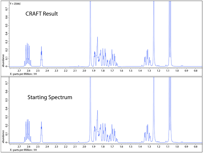 JEOL has expanded the quantitative and statistical analysis capability of its NMR spectrometers through collaboration with the developer of the CRAFT (Complete Reduction to Amplitude-Frequency Table) data processing technique. In conjunction with the recent JEOL DELTA NMR software release 5.3.0, CRAFT for DELTA V1.0 provides direct time domain-to-spreadsheet analysis, allowing for more objective extraction of quantitative information for compounds of interest, provides statistical analysis for metabolomics, reaction monitoring or quality control. Peaks that are too close to effectively quantify by traditional integration are completely resolved sinusoids in the time domain with separate information of frequency, amplitude, phase and decay rate available as numbers in a table.