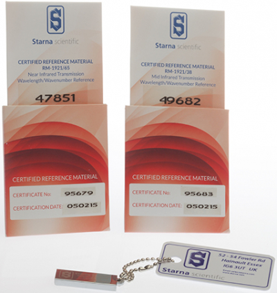 Starna now supply polystyrene film references for use in the mid-infrared and near infrared with full traceability to NIST and covering a total wavelength range from 1.1 µm (8750 cm–1) to 18.5 µm (540 cm–1). These references are produced within the scope of Starna’s ISO Guide 34 accreditation and certified under ISO/IEC 17025. They will also comply with the newest revisions of US Pharmacopoeia General Chapters 854 and 1854 on mid-infrared spectroscopy. The references are available in two film thicknesses: RM-1921/38 is a 38-µm polystyrene film with 14 certified peaks from 540 cm–1 to 3080 cm–1 (18.5–3.25 µm) whose values are traceable to NIST SRM 1921b. A thicker version, RM-1921/65, is 65-µm thick and in addition to the 14 peaks in the mid-IR 8 peaks are certified in the NIR from 3060 cm–1 to 8750 cm–1 (3.25 µm to 1.15 µm). These peaks are traceable to NIST SRM 2065. The references are presented as card mounted films in the conventional industry pattern which slip into the standard sample holder of any FT-IR instrument.