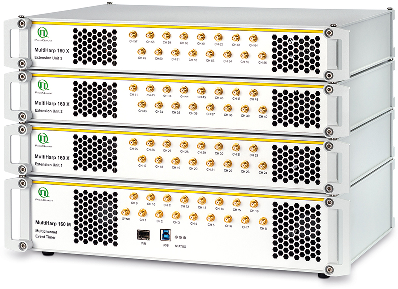 PicoQuant’s latest multichannel event timer, the MultiHarp 160, is a plug-and-play time tagger and Time-Correlated Single Photon Counting (TCSPC) unit. It is optimised for applications requiring up to 64 timing channels with a time resolution of 5 ps and dead time of less than 650 ps. The MultiHarp 160’s number of synchronised input channels can be scaled from 16 to 64. A common synchronisation channel, supporting sync rates of up to 1.2 GHz for periodic signals, is available as timing reference for all channels. Time tags from all input channels are combined into a single data stream that is accessible via an USB 3.0 interface. The data stream is also accessible to external FPGA boards via a dedicated interface, enabling great flexibility in tailoring the way how data is preprocessed to the specific needs of an application. Furthermore, the MultiHarp 160 supports synchronisation of multiple devices via White Rabbit timing networks, GPS, PPS or external references.