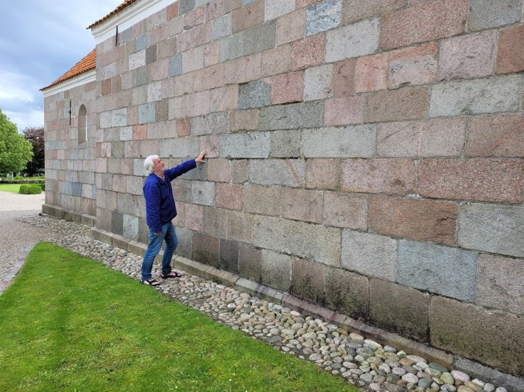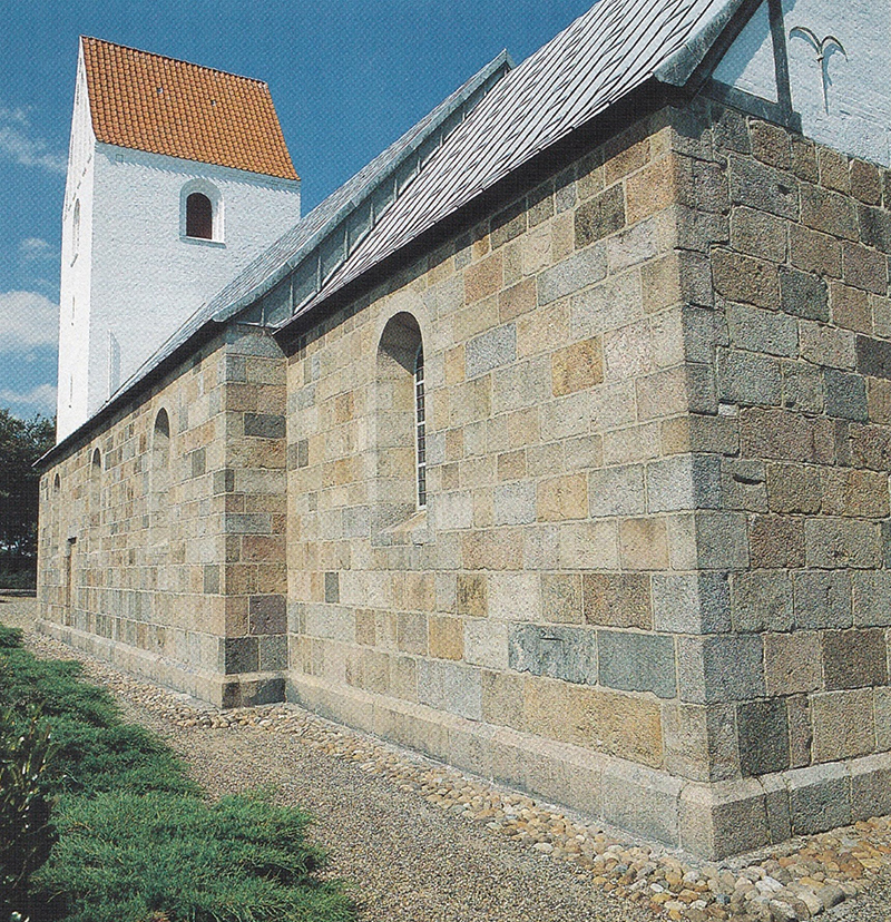 Figure 3. “Asp Kirke”, Jutland, typical medieval Romanesque church illustrating the diverse assembly of hewn rock types. Note later improvement (enlargement) of windows, later lead roofing and addition of a bell tower.
