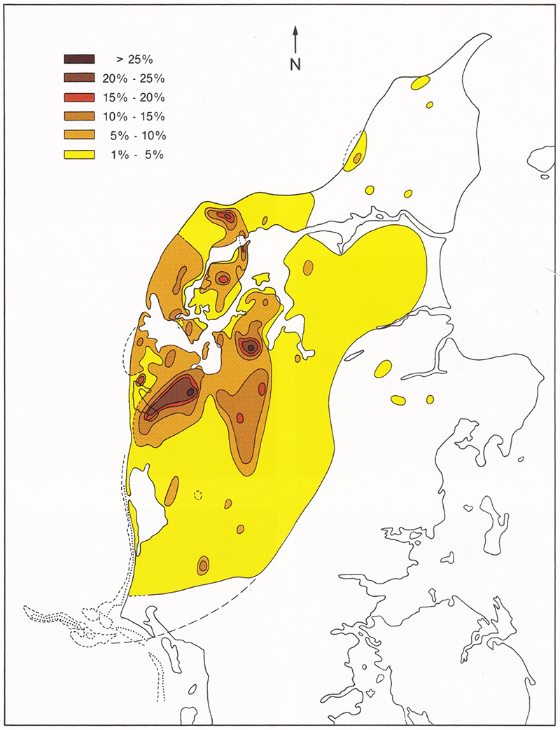 Figure 7. Relative % occurrence of larvikites (sum of all identifiable types) in Jutland hewn rock churches. The field work for this remarkable compilation was undertaken in a series of intermittent summer campaigns by Noe-Nygaard during his tenure as professor at University of Copenhagen, see Noe-Nygaard.1,2