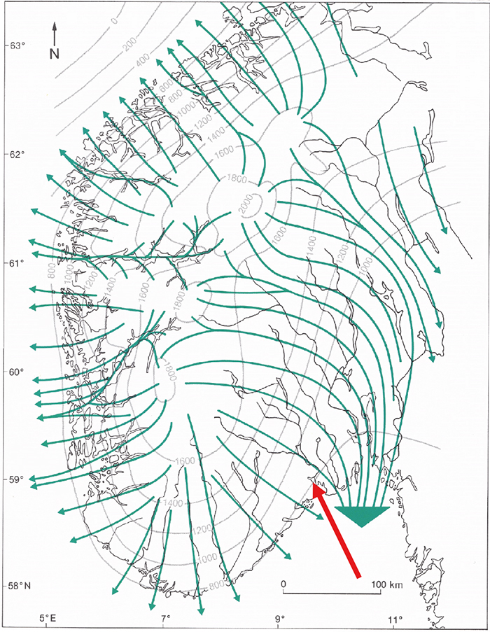 Figure 8. Ice age glacial flow direction patterns in southern Norway, see Nesje et al. (1988).5 Contours show the modelled surface of the glacier in late-Weichsel (ca 20,00 years ago). Illustration with permission from GEUS.