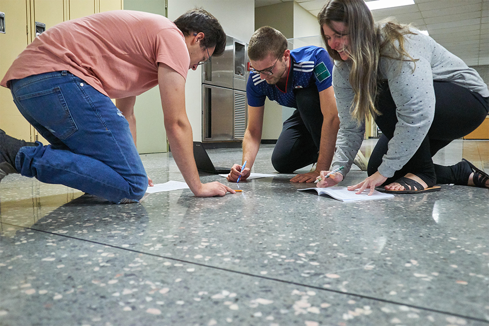 Figure 1. Geoscience students hard at work planning tile/sub-tile divisions as a basis for “analysis” (counting and deriving the frequency of component clasts in the terrazzo makeup). The enthusiasm is tangible.