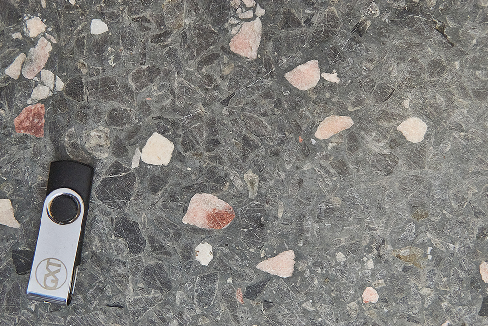 Figure 2. Typical terrazzo tile from the hallways of Sciences de la Terre, Université du Québec à Chicoutimi, with USB stick as scale; see also Figure 3.