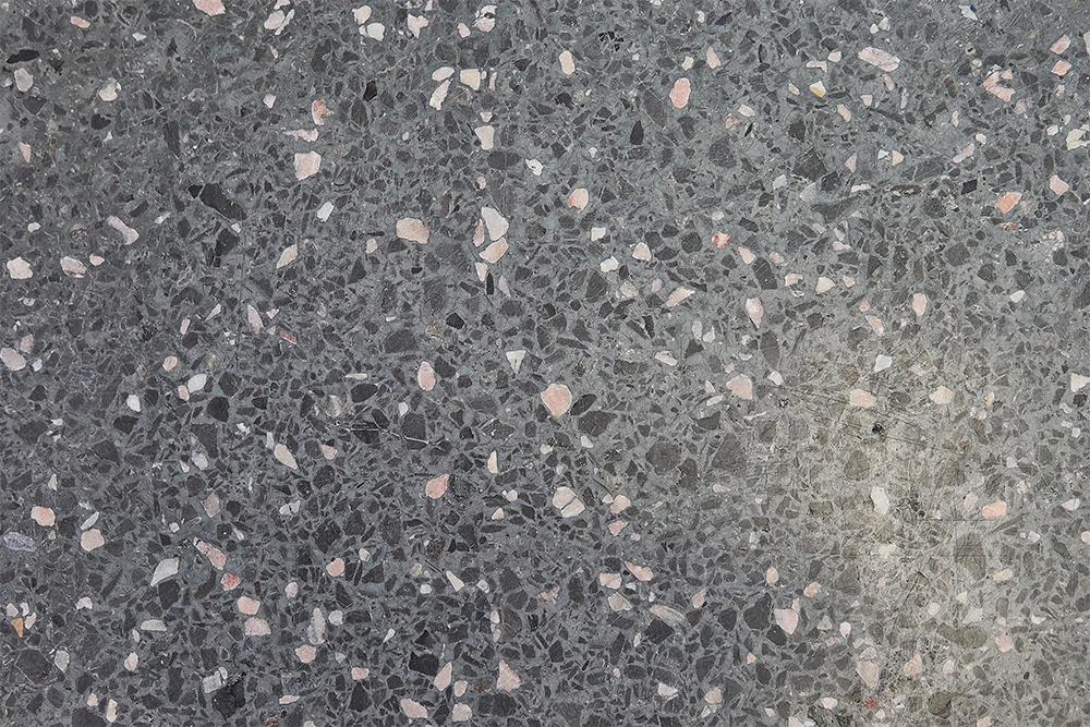 Figure 3. Overview photograph of a primary floor terrazzo tile as used for the experiments. The field of view measures approximately 30 cm across. Observe the “pleasing” heterogeneous spatial distribution of the three fragment types (pink, black, white); grey fragments were not included in the experiment, see text.