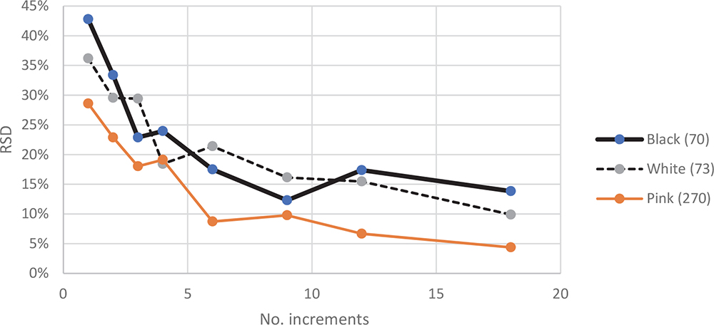 Figure 4. Graph showing the relative standard deviation of composite sampling results as the number of increments increases. The number in parenthesis is the number of fragments per m2 corresponding to a full tile.