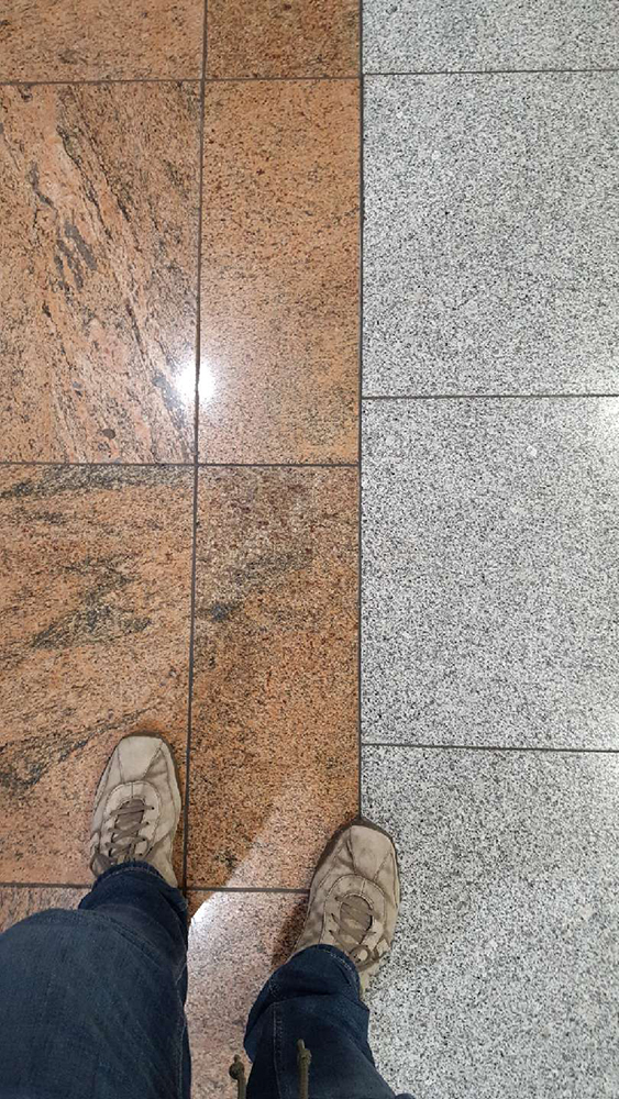 Figure 5. Two very different airport tile types (researcher POV), the one to the right is the South African white, two-feldspar granite mentioned in the Epilogue. Note the considerably more complex, partially deformed red granite type to the left, which can also be subjected to image analytical characterisation, although this constitute a much more ambitious image acquisition and data analysis task.