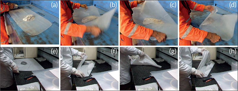 Figure 1. Pulverised rock powder for fire assay is “homogenised” by rolling or flicking a powder batch on a flexible sheet immediately before aliquot extraction. (a–d) Rolling powder from side-to-side operation performed 40 times. (e–h) Same operation, but here only performed 20 times. Still photos extracted from video recordings. Illustration copyright: RCAM teaching collection; used with permission.