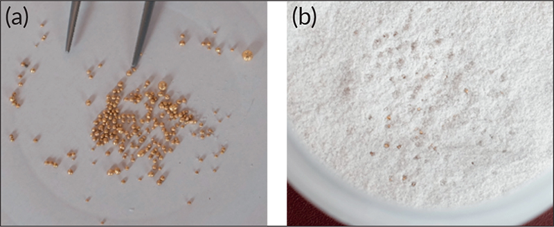 Figure 2. a) Approximately 300 gold grains, ranging in size from 100 µm to 300 µm, and b) finely ground quartz matrix showing gold grains on surface before mixing. Illustration copyright: RCAM teaching collection; used with permission.