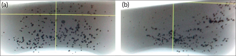 The plastic batch container with gold grains/quartz powder was first thoroughly shaken in an attempt to mix the contents, as per universal common belief that shaking = good mixing. The content was then X-ray scanned,1 showing a fairly even distribution of gold grains as seen in the vertical cross-section of the container as shown in Figure 3(a).