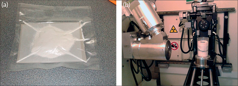 The processed powder batch was then carefully placed in a plastic bag, which was immediately vacuum sealed so that the spatial distribution of the gold and quartz grains achieved by rolling could not be disturbed by any further handling, Figure 4(a). This vacuum sealed bag was placed in an X-ray tomography unit housed in the Palaeosciences Unit at Wits University, and scanned [Figure 4(b)].