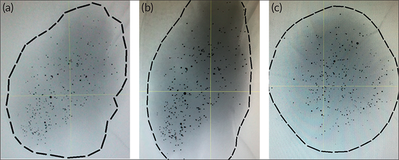 Figure 5. X-ray scanning images representing increasing rolling intensities. (a) Gold grains in the first experiment (lowest rolling intensity). (b) Distribution of gold grains for the second experiment. (c) Gold grain distribution for the third experiment (highest rolling intensity). Illustration copyright: RCAM teaching collection; used with permission.
