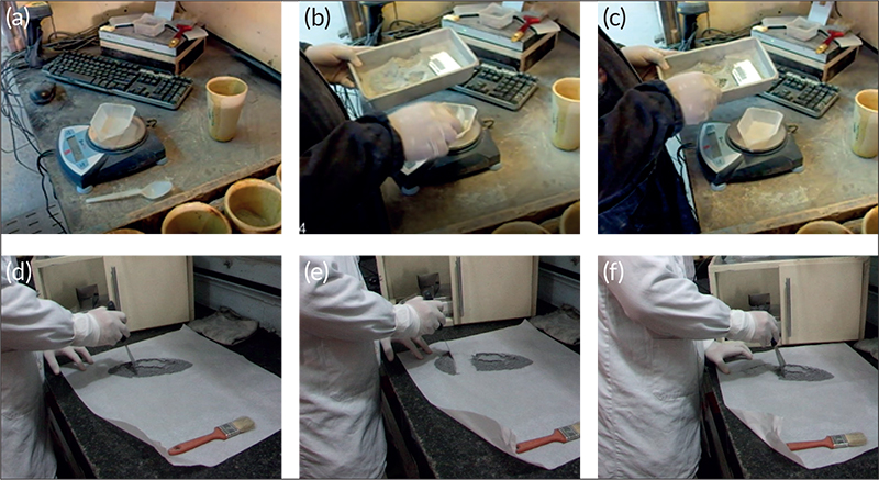 Figure 6. (a–c) Sequence of steps showing mass-driven scooping of powder from a pulverised batch in the creation of a fire assay aliquot. (d–f) Splitting of a batch into three more-or-less equal aliquots. However, both approaches are flawed w.r.t. counteracting the empirical heterogeneity encountered in the pre-aliquoting laboratory batch. Obviously “mixing” helps but there is no guarantee of achieving sufficient mixing in and of itself. Illustration copyright: RCAM teaching collection; used with permission.