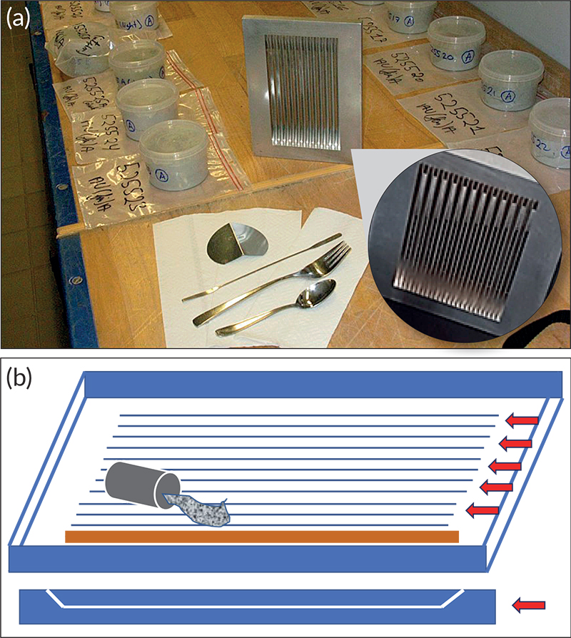 Figure 7. (a) Foreground: a variety of common but misguided laboratory equipment with which to perform sub-sampling operations on the laboratory bench: fork (a mixing tool) and spoon, spatula a.o. for extracting analytical aliquots, none of which respect the representativity demands from the TOS. Background: the famous, but little known, “Ingamells micro-splitter”, an ingenious implement invented by Charles Oliver Ingamells (1916–1994),3 for use in sub-sampling miniscule amounts of reference materials for microprobe analysis. This splitter is preferred for all last-stage mass-reduction of fine powders and similar because it is guaranteed to be representative cf. the spatula, which still dominates in very nearly all the world’s analytical laboratories. (b) Schematic of the function of the Ingamells micro-splitter, a stationary riffle splitter machined from a solid aluminium frame with an even number of alternating chutes (riffles). Every second chute is machined to penetrate fully through the frame—with the complementary set only machined to 2⁄3 depth. The chutes that go all the way through allow 50 % (vol/vol) of the poured mass to pass completely through the frame and to become the reject. While the intercepted material staying in the 2⁄3 depth chute grooves becomes the 50 % split off sub-sample. The non-penetrating chutes have a slanted (or curved) end configuration to facilitate “sliding out” the intercepted (sampled) material. Ingamells micro-splitter courtesy the estate of Oliver Ingamells through kind donation from Francis Pitard. Illustrations copyright: KHEC teaching collection; reproduced with permission.