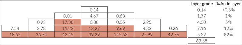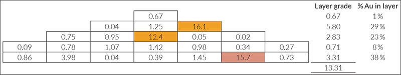 Figure 8. Cross-section transect through a pulp pile showing 23 extracted assays with marked “segregated” gold at the lower part of pile (red highlights). The global grade of the 2045 g pile is 29.1 g t–1 Au based on the complete total of 42 fire assays. The distribution shown is approximate relative to the challenge of complete 3D pile sampling, but the direction of this transect was chosen at random.