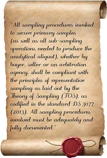 Sampling, although strictly a technical operation, nevertheless deserves the full attention of management. Ignorance of the TOS results in unacceptably high risks in decision making. If a “sample” does not qualify as representative (in reality a “specimen”), it may be part of the reason for significant production loss, commercial disputes, disruption of a commercial partnerships and, potentially, high costs for third parties too.