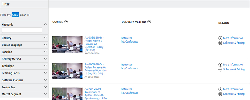 Agilent’s approach is different to Thermo’s in the way the content is built with almost a complete dump of all their resources: generic information presentations as well as very targeted highly specific instrument operation training in one location. Before you give up in despair, you need to use the filters on the left-hand side of the screen, which are very useful in firstly filtering on “free” content and then drilling down to those subject areas you are actually interest in, rather than scrolling through pages and pages of links, see Figure 2.